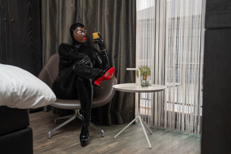 I used to enjoy my latex fetish on my own and occasionally captured selfies in latex. This is from a set I did in January 2016. Just basic in full latex with a body harness.